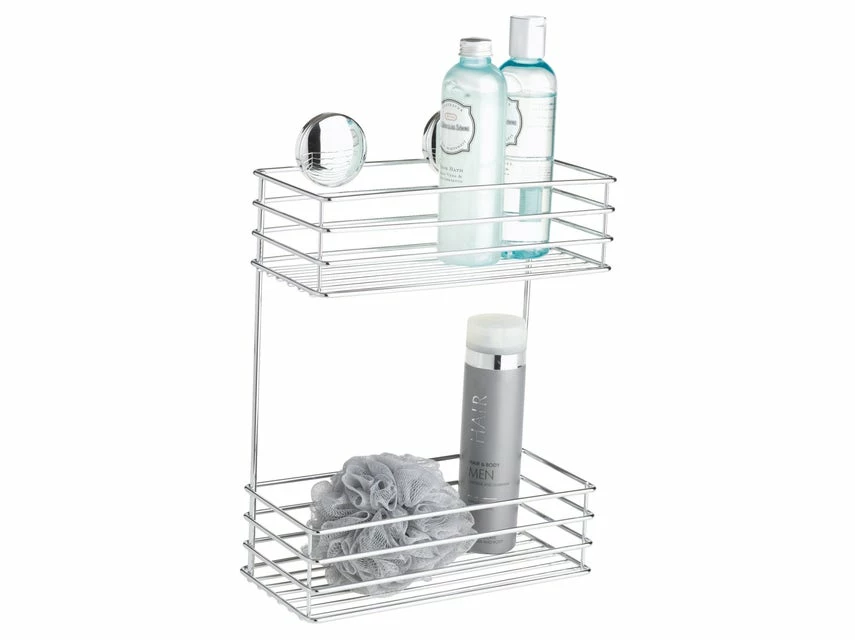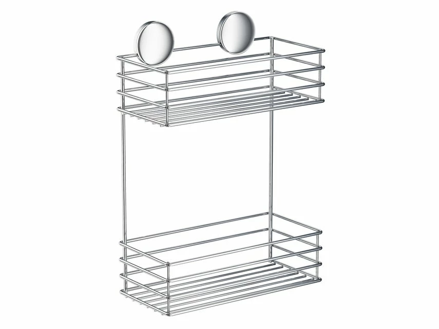 Der doppelte Duschkorb aus verchromtem Edelstahl bietet viel Platz für Duschutensilien und überzeugt mit einem eleganten Design.