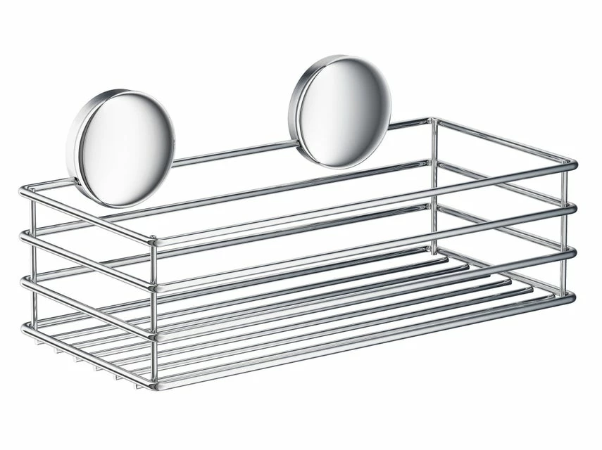 Der Duschkorb aus verchromtem Edelstahl bietet viel Platz für Duschutensilien und überzeugt mit einem eleganten Design.