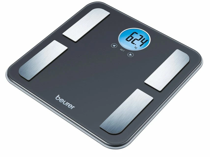 - Messung von: Gewicht, Körperfett, Wasser, Muskelanteil und Knochenmase