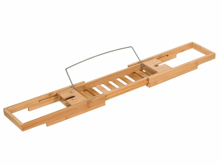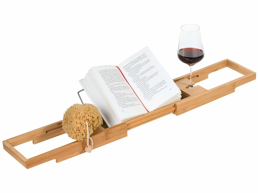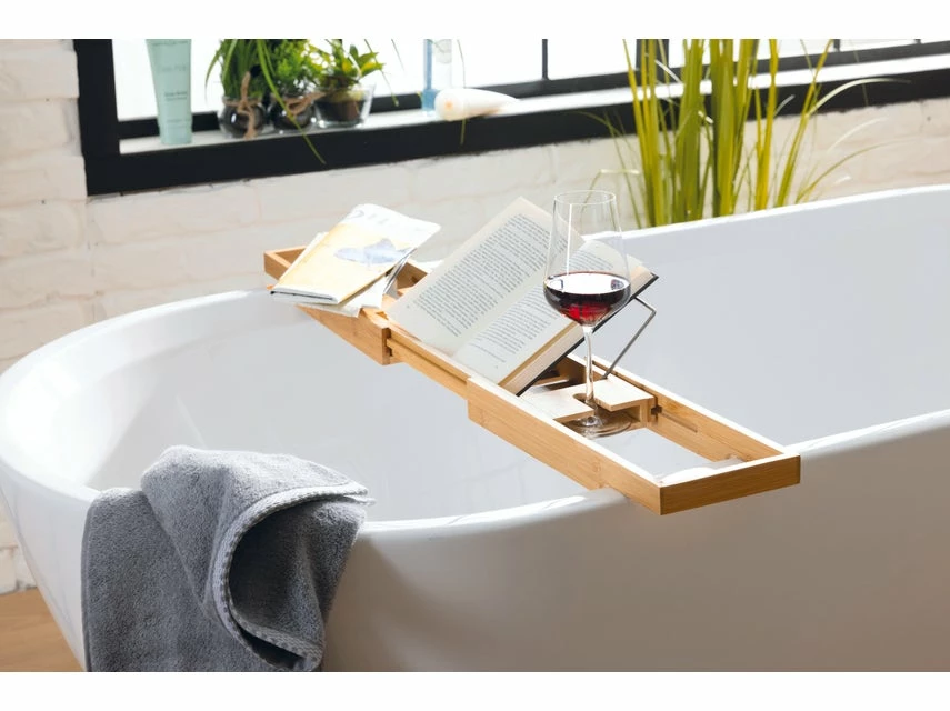 Genießen Sie ein entspanntes Schaumbad nach einem langen Arbeitstag! Mit dieser vielseitigen Badewannenablage aus feuchtigkeitsresistentem Bambus wird die Zeit im Bad für Sie noch erholsamer. Dank der klappbaren Stütze können Sie sich in ein gutes Buch vertiefen oder mit dem Tablet einen Film schauen. Auch Ihre Geschmakcksnerven nicht zu kurz, denn das Badaccessoire bietet zudem auch noch Halterungen für zwei Weingläser. Machen Sie Ihr Badezimmer zum Home-Spa mit Relaxfaktor!