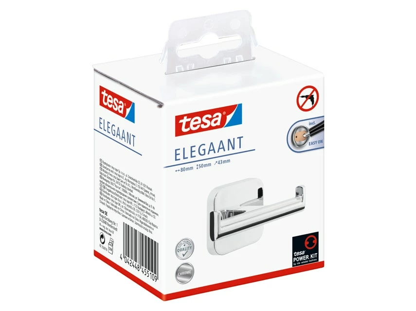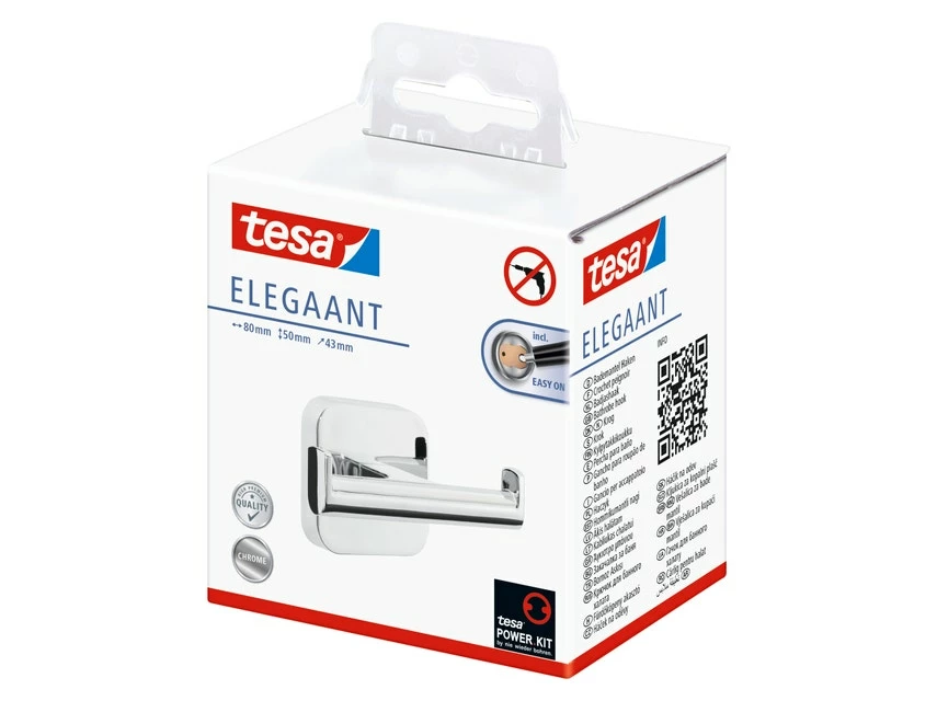 Der tesa® ELEGAANT Design-Haken lässt sich ohne Bohren an der Wand befestigen. Mit seinem eleganten Design und seinen zwei Haken ist er eine Bereicherung für jeden Haushalt. Sie können den Haken jederzeit wieder entfernen und mit einem neuen Befestigungsadapter sogar wiederverwenden.