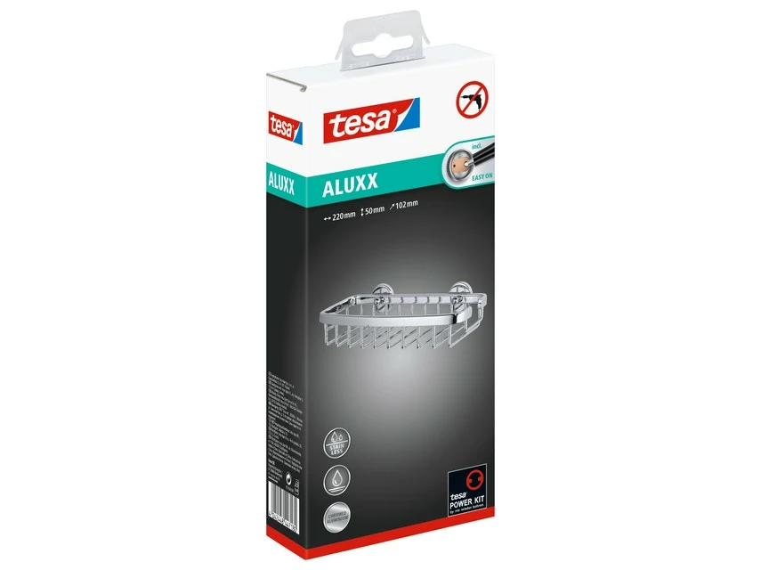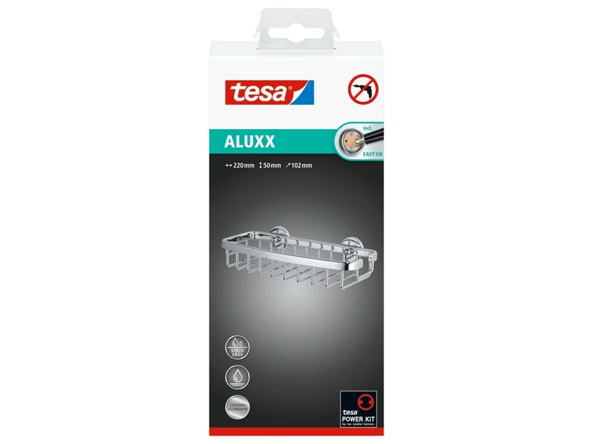 Die zeitlos elegante tesa® ALUXX Duschablage zum Kleben eignet sich ideal zur Aufbewahrung von Duschgel, Shampoo und anderen Duschutensilien. Sie wird dank innovativer Klebelösung ohne Bohren angebracht, kann jederzeit wieder entfernt und mit einem neuen Befestigungsadapter wiederverwendet werden.
