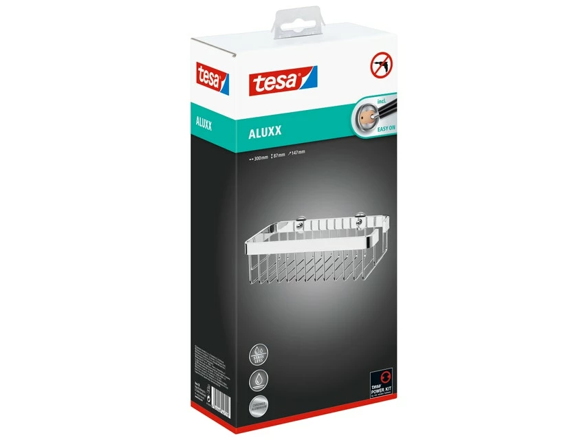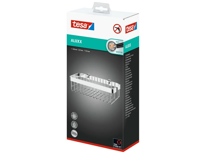 Die tesa® ALUXX Badablage bietet mit einer Breite von 30cm sehr viel Platz für Bad- und Duschutensilien. Dank des extra tiefen Bodens haben auch höhere Objekte einen sicheren Stand. Die elegante Badablage wird ohne Bohren befestigt, kann jederzeit abgelöst und wiederverwendet werden.