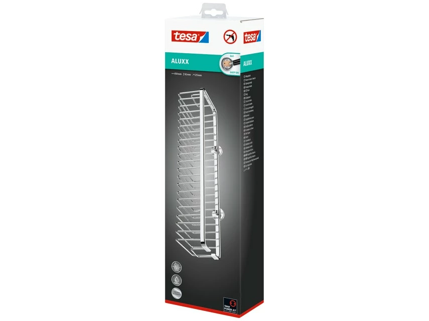 Der extra breite tesa® ALUXX Duschkorb wird ohne Bohren an der Wand befestigt. Direkt in der Dusche oder über der Badewanne sind dabei die bevorzugten Orte. Er bietet sehr viel Platz für Ihre Duschutensilien und kann jederzeit wieder abgelöst werden. Zudem punktet er mit einem zeitlos eleganten Design.