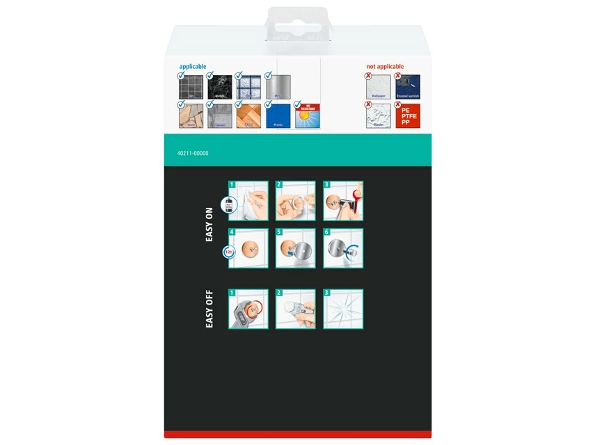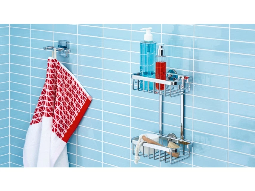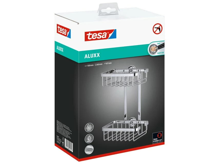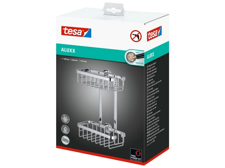 Das tesa® ALUXX Duschregal wird ohne Bohren befestigt und bietet mit seinen zwei Duschkörben viel Platz für Duschutensilien. Da Sie das Duschregal ankleben und jederzeit wieder entfernen können, bleiben Ihre Fliesen unbeschädigt. Mit einem neuen Adapter können Sie das Regal wiederverwenden.