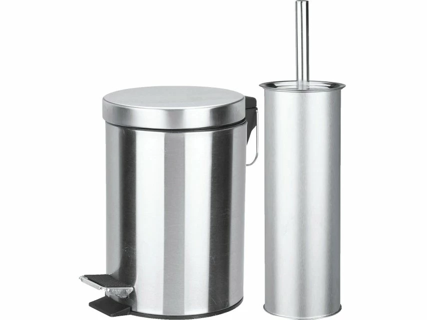 In Ihrer Toilette sind Sie mit dem WC-Set Basic Plus perfekt ausgestattet. Das Set aus klassischem Edelstahl in Silber besteht aus einem WC-Bürstenhalter mit Bürste und einem Kosmetikeimer mit einer Füllmenge von ca. 3 Litern.