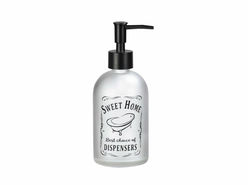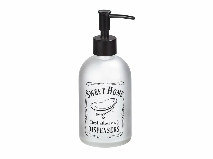 Ausstattungsmerkmal: Die stabile Glasflasche wirkt aufgrund ihrer transparenten Optik silbrig und matt. Der extravagante Aufdruck in Schwarz macht den Seifenspender zu einem absoluten Eyecatcher in Bad & Gäste-WC